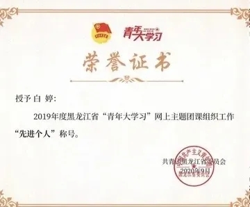 白婷荣获2019年度黑龙江省“青年大学习”主题团课组织工作“先进个人”称号。